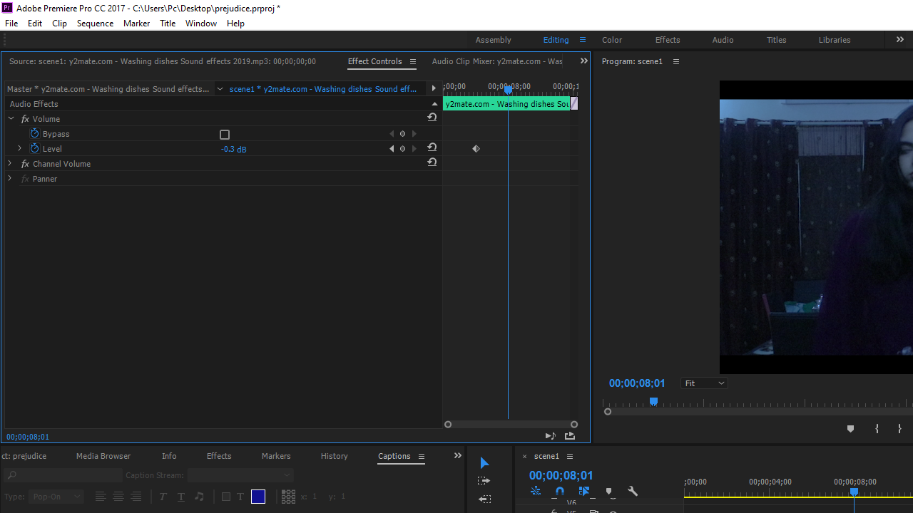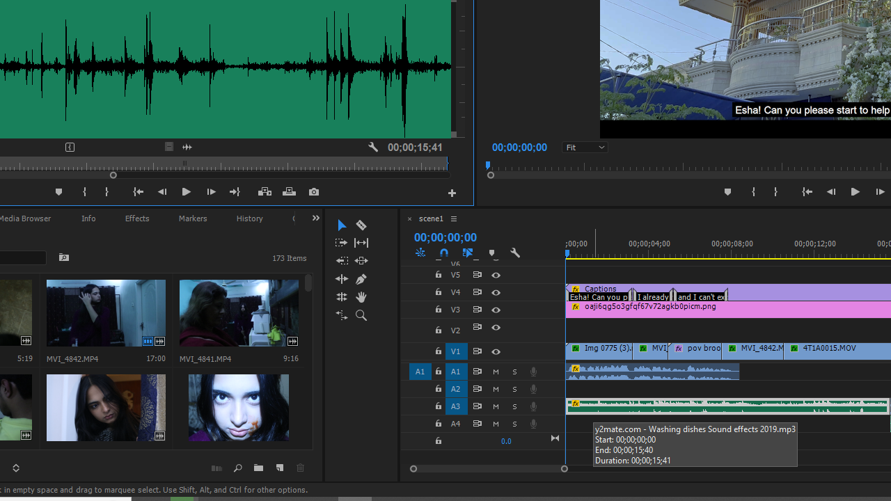 As the video starts, we can immediately hear a person washing the dishes and Esha’s mother scolding her. I downloaded the dish washing sound effect from YouTube by using y2mate.com and turned the volume down to -0.3dB. I then increased the audio in which the mother scolds Esha to 1.7dB so I could put emphasis on the mother scolding Esha while angrily doing the dishes. I also made use of the L-cut to make sure my audience stays interested through out.