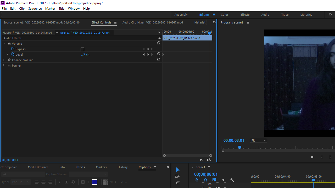I edited ‘PREJUDICE’ in Adobe Premiere Pro – 2017 version. Editing ‘PREJUDICE’ took me around 5 days (editing time-lapse). This was a challenging task for me as I was not used to of the software and I was faced with multiple trial and errors, however I made it through every obstacle and by the end, my project looked a little bit like this: